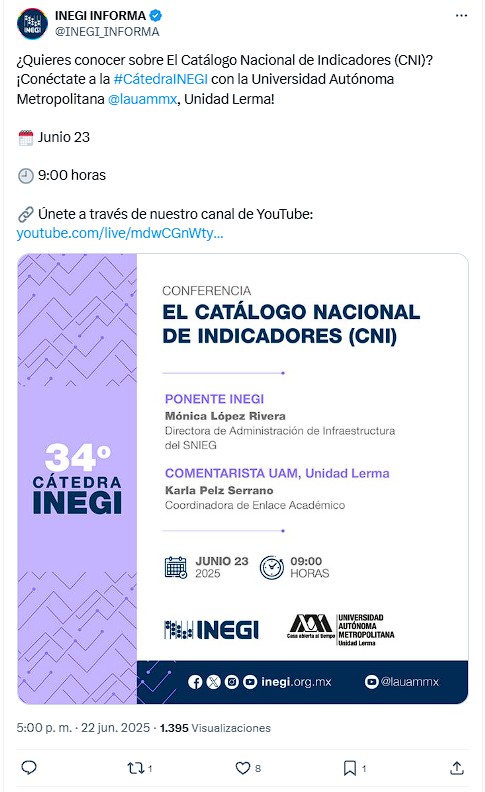 ¿Quieres conocer sobre El Catálogo Nacional de Indicadores (CNI)? ¡Conéctate a la #CátedraINEGI con la Universidad Autónoma Metropolitana @lauammx , Unidad Lerma!