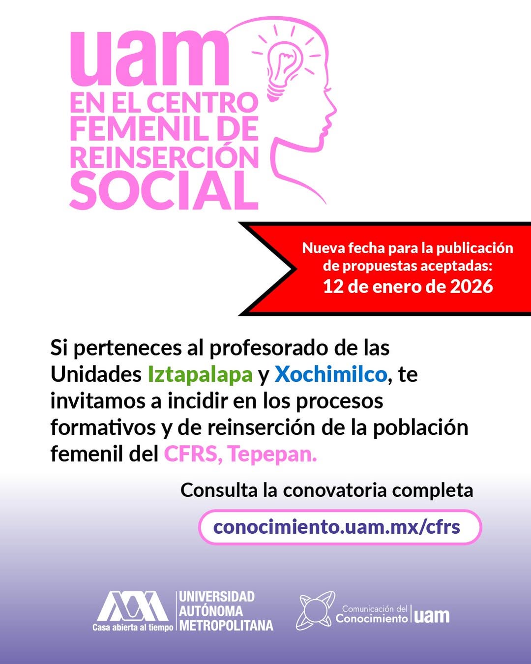 La publicación de propuestas aceptadas de la convocatoria UAM en el Centro Femenil de Reinserción Social (CFRS-Tepepan) se recorrerá al 12 de enero de 2026.